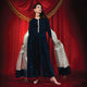 A deep maroon velvet dress with a flattering fitted bodice and structured waist panels that create a graceful, flowing flare. Chic tassels at the waist and sleeve cuffs add a modern, stylish edge. The rose gold lama dupatta contrasts beautifully with its soft drape, subtle sheen, and minimal hand-worked detailing on the corners. Paired with matching trousers, the full look comes together with effortless elegance, refined charm, and a polished festive vibe.